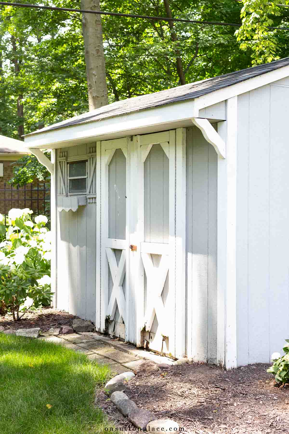 This little outdoor storage shed has been part of our backyard for over 25 years. It came with the house, and aside from one paint job, I hadnโt done much to it. The doors were weathered and rotting at the bottom, the latch was rusted, the paint had faded, and the cement blocks in front were sunken and messy. It was long overdue for some attention.