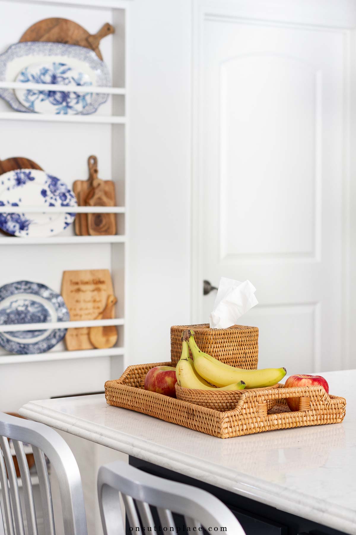 A well kept home doesn’t mean everything has to be put away. It means the things you use every day have a place that makes sense. On my kitchen island, I keep a simple tray with tissues, a fruit basket, and a few odds and ends that tend to land there. It’s not styled and it’s not always neat, but it’s useful. Because those items are contained, the space feels intentional instead of cluttered.
